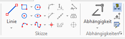 Befehle aus Gruppen “Skizze“ und „Abhängigkeiten“, z.B. Werkzeuge Linie, Rechteck, Abhängigkeiten, Bemaßung |